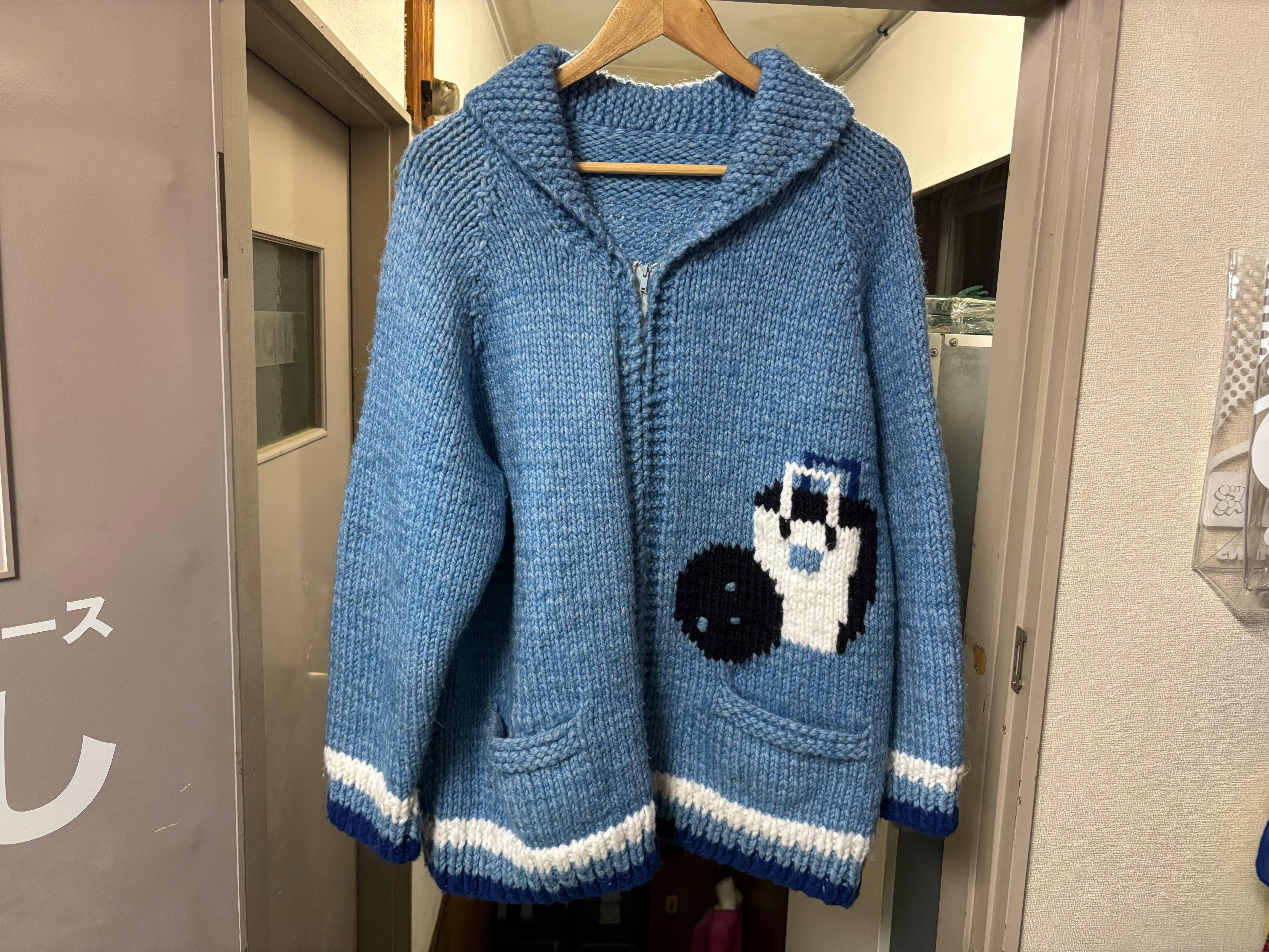 カラーは水色、ラグランでジップアップタイプのウールショールカーディガンです。