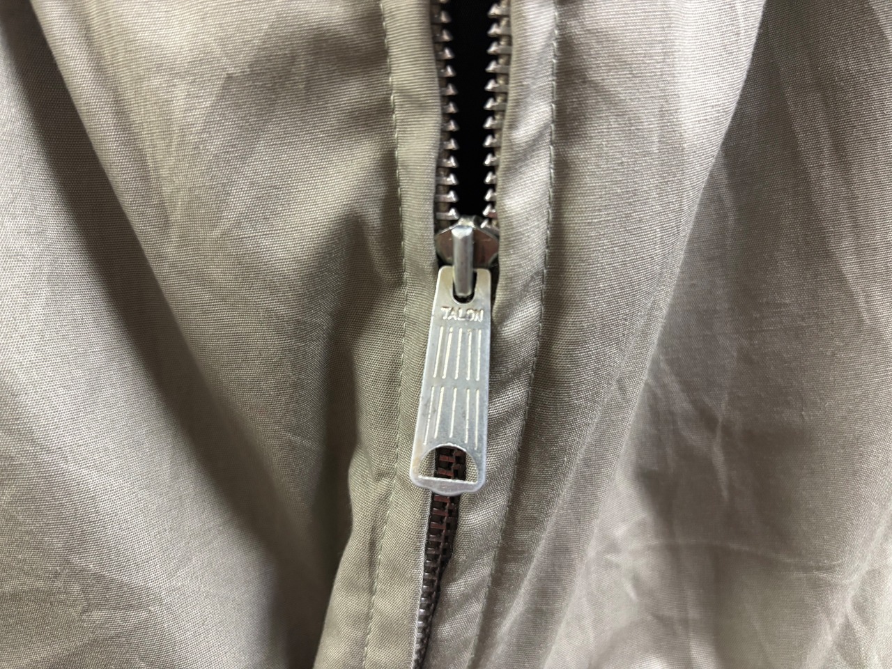 カラーはカーキ系(グレーカーキ寄りのライトカーキ)、アルミ製TALONジップ使用、MADE IN USAです。
